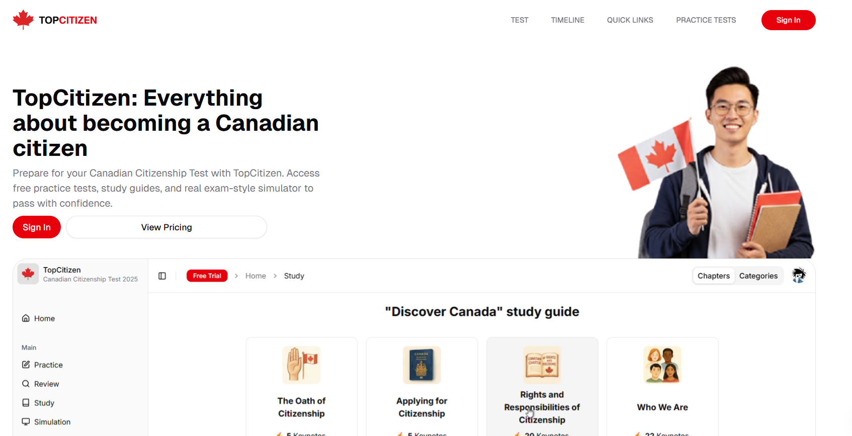 TopCitizen Platform: TopCitizen offers comprehensive preparation tools designed specifically for the Canadian citizenship test. Their platform includes practice tests, study materials, and helpful guides to ensure you're fully prepared.
